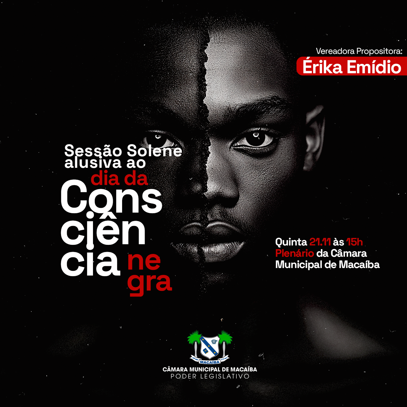 Convidamos todos para a Sessão Solene em alusão ao Dia da Consciência Negra, que acontecerá no dia 21 de novembro, às 15h, no plenário da Câmara Municipal de Macaíba.